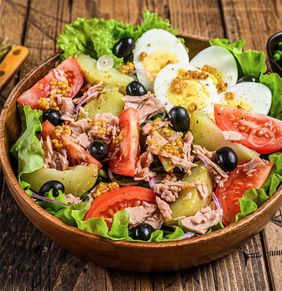 - la salade niçoise, composée de tomates, de poivrons, d'œufs durs, d'anchois, de thon, d'oignons et d'olives.